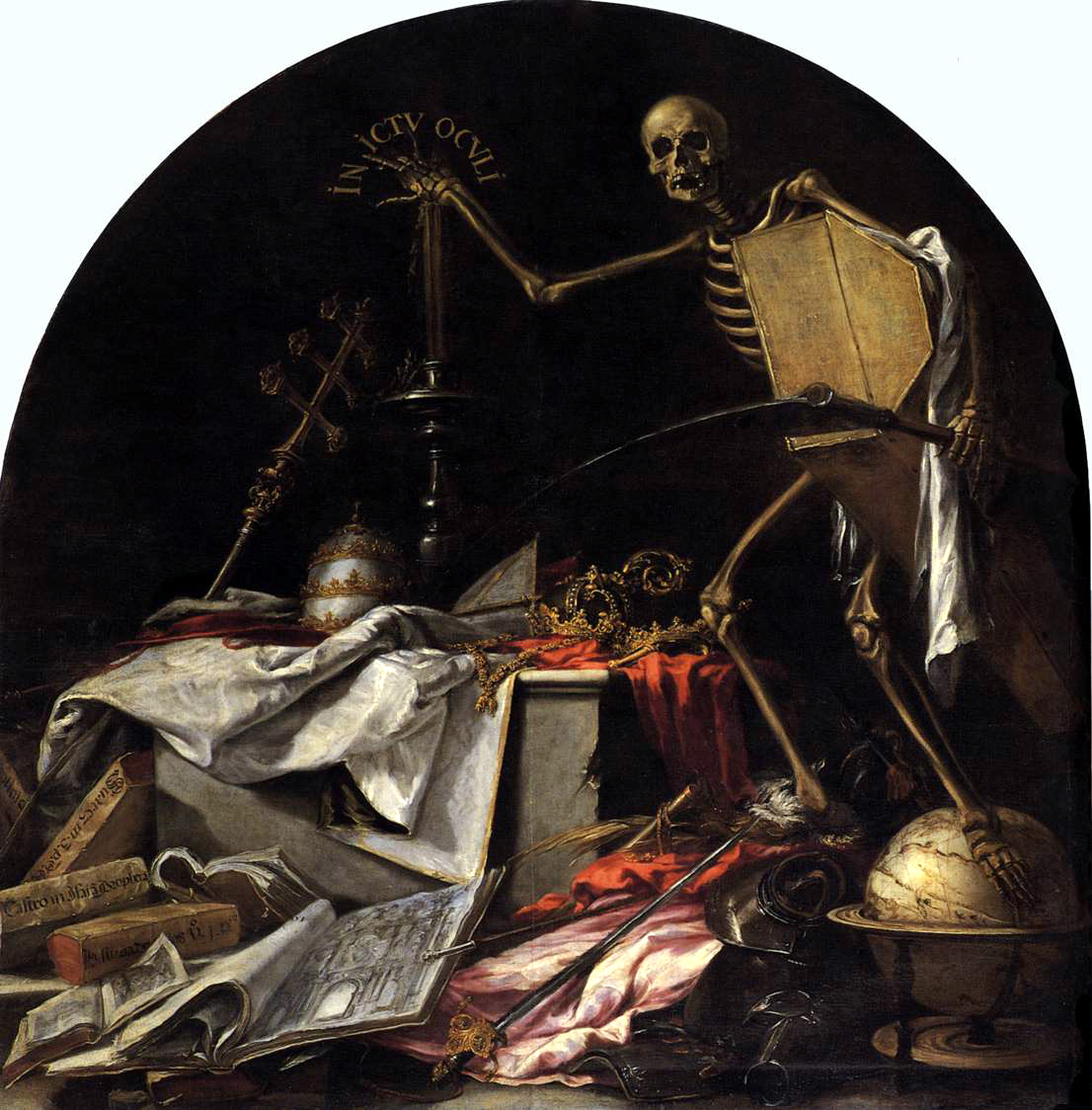 Igual de terrible es este bodegón de Antonio de Pereda que se conserva en el Museo de Zaragoza, y al que le cuadra perfectamente el título de “Naturaleza muerta” que se suele dar a este tipo de pinturas. Tres calaveras nos recuerdan esa frase que aparece en muchas tumbas: “Como te ves, yo me vi. Como me ves, te verás“. Y por si no quedara suficientemente claro, junto a ellas hay un reloj con la llave para darle cuerda. Tic, tac, tic, tac, tic, tac…