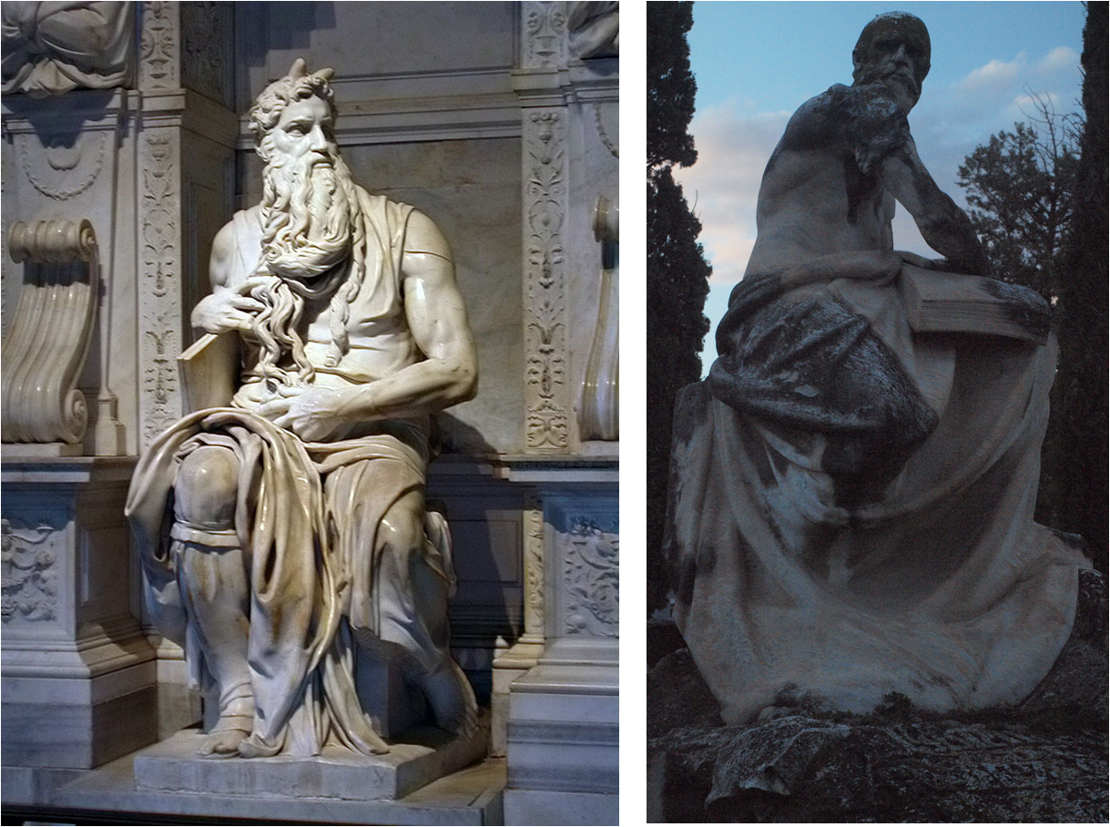 El Moisés es pura tensión y movimiento, aunque debido a su colocación en la tumba solo podemos verlo de frente y en parte desde los lados. En cambio la escultura de Clarasó está colocada en el centro, de forma que podemos girar alrededor de ella y cada punto de vista nos cuenta nuevas cosas.
