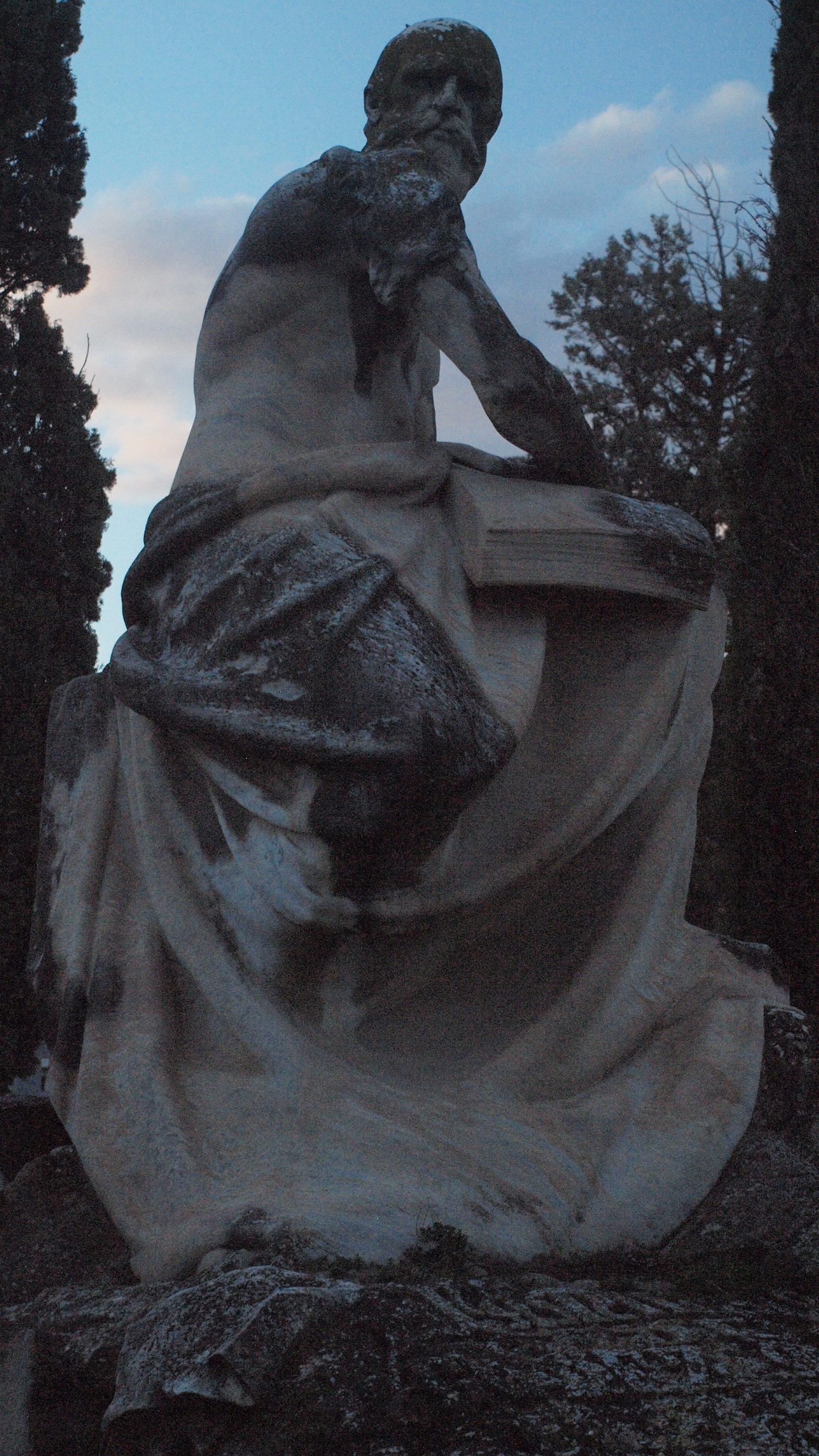 Estamos en 1907 y Enrique Clarasó, uno de los mejores escultores funerarios que ha habido en España, nos dejó aquí una obra magnífica hecha para la familia Gómez y Sancho (propietaria de un almacén de tejidos que estaba en la calle Manifestación y que cerró hace no mucho): El Tiempo pasa las hojas del libro de la vida.  Un anciano calvo y de larga barba, que mira no sabemos dónde, tiene entre sobre sus rodillas un gran libro cuyas hojas va pasando sin mirarlas siquiera…