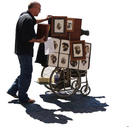 ¿Creíais que ya no existían fotógrafos minuteros? Pues aquí tenéis la prueba de que sí. Más o menos así sería el chiringuito de Angel Fernández Cordero. Todo portátil, para podérselo llevar a cuestas de lado a lado