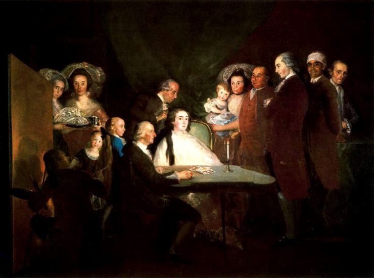 Es de noche, y la familia está reunida en una habitación que apenas está insinuada. Sentados a la mesa están el infante, que hace un solitario, y su mujer, a la que están peinando. A su lado, una nodriza lleva en brazos a su hija pequeña. Los otros dos están detrás de su padre, muy serio el chico, el heredero, y detrás de él su hermana, que mira curiosa. Alrededor, personas de la casa: criadas, el administrador, quizá incluso el músico Luigi Boccherini, que trabaja para el infante… Y abajo a la izquierda Goya, que le hace un guiño a “Las Meninas” de Velázquez y se retrata pintando. En resumen, un momento íntimo, en el que en vez del falso esplendor de un retrato cortesano lo que encontramos es una sorprendente apariencia de verdad.