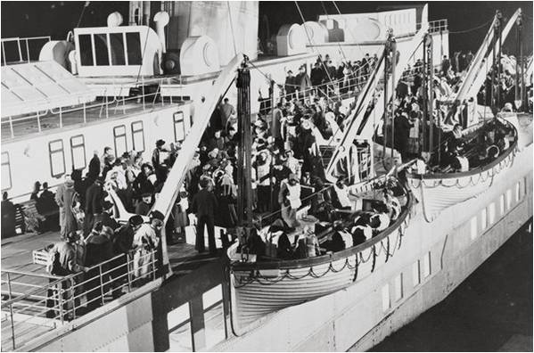 La gente subiendo a los botes en una película de los años 50, “La última noche del Titanic”