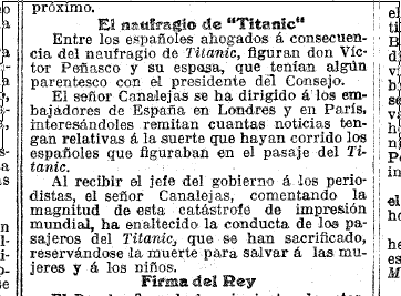 Otra pasajera que iba en el mismo bote contó unos días después todo esto en una entrevista para el New York Herald: “Entonces la señora Peñasco empezó a chillar el nombre de su marido. Fue terrible. Le pasé el timón a mi prima y me puse acurrucada junto a ella, tratando en lo posible de consolarla. Pobre mujer. Sus sollozos ablandaron nuestros corazones y sus palabras eran imposibles de entender debido a su tristeza (…) Cuando el terrible final llegó, utilicé lo mejor de mi misma para intentar distraer a la señora española y que no oyese los agonizantes sonidos de los que se ahogaban en el mar”.