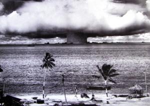 París, 5 de julio de 1946 – hay un concurso de belleza en París . Hasta aquí, nada fuera de lo normal, pero… de pronto aparece una modelo con un bañador de dos piezas que deja ver ¡¡¡¡EL OMBLIGO!!!! Escándalo total, un cataclismo como no se había vivido otro desde que… dos semanas antes los americanos hicieran en las islas Biquini sus primeras pruebas nucleares tras la II Guerra Mundial. Dos bombazos tan impactantes que a alguien se le ocurrió compararlos y aquella prenda acabó recibiendo el nombre de aquellas islas del Pacífico: Biquini.