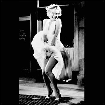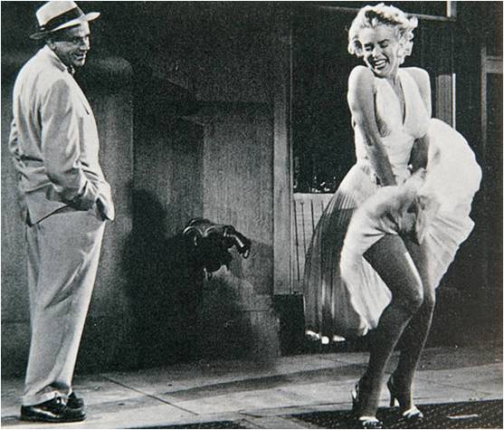 Un verano curioso el neoyorquino, en cualquier caso. Caen las hojas, suben las faldas. Y una secuencia curiosa ésta, porque nunca se ve la imagen que aparece en esta fotografía archiconocida. Nunca vemos la cara de Marilyn mientras su falda vuela por los aires, aunque nos la imaginamos. Ni vemos babear al escritor, aunque sabemos que se está derritiendo por dentro. Sólo vemos las piernas. Unas piernas deseadas por media Humanidad y una parte de la otra media. Las piernas de una jovencita inocente que logró sin proponérselo que medio Manhattan peregrinara hasta el lugar de la grabación.