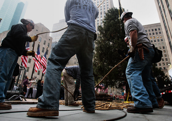 El traslado de un árbol de más de 8 pisos de altura es una operación costosa y delicada, y si tenemos en cuenta que lo han convertido en todo un ritual, nos podemos imaginar la expectación que hay alrededor. Los medios de comunicación siguen el traslado paso a paso, hasta que el árbol queda instalado en su sitio. Y entonces… comienza la siguiente fase del proceso: la decoración. Y para eso lo primero que hay que hacer es construir un enorme andamio alrededor de nuestro árbol.