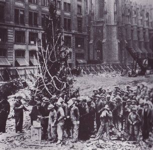 Estamos en 1931 (un año antes de la foto de los obreros sentados en la viga), en plena Gran Depresión (todo es grande en América). Los trabajadores que están construyendo el Rockefeller Center instalaron un pino que adornaron con guirnaldas de papel y latas de conserva vacías. Dos años después ya se hizo un “encendido” oficial, y en 1951 comenzó a retransmitirse por televisión. Hoy es un fiestón, con cientos de miles de personas y famosos, famosillos y famosuelos (hace algunos años, por ejemplo, estuvieron allí Justin Bieber para las adolescentes, y Michael Bublé para las personas con gusto musical) que actúan junto a las Rockettes, que son las verdaderas protagonistas de la fiesta. ¿Las habéis visto alguna vez? Pues dadle a play y disfrutadlas. ¿Habéis visto alguna vez algo más perfecto? ¿Cuántos miles de horas de ensayos tiene que haber detrás de esas piernas que se levantan a la vez?