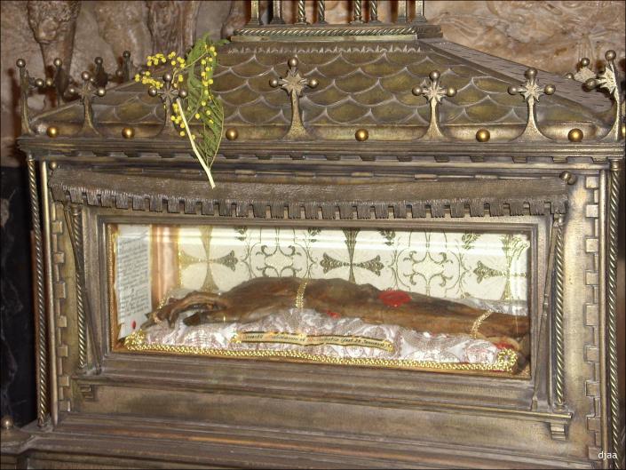 Si estáis pensando que San Vicente está tranquilo y completo en su tumba, estáis completamente equivocados. Está repartido en trocicos por media Europa, que para eso fue uno de los santos más venerados de toda la Edad Media. Así que continuamos nuestro viaje para irlo reconstruyendo y volvemos a Valencia, porque ¿los valencianos no se quedaron nada? Pues no sabemos si se lo cortaron antes de montarlo en el barco o lo reclamaron después, pero el caso es que tienen el brazo incorrupto (y un poco chamuscado, de tanto martirio) en una capilla de la catedral de Valencia. Eso sí, lo suyo les ha costado recuperarlo, pues un obispo de finales del siglo XI parece que era aficionado a llevárselo de viaje. Se fue para Tierra Santa y se llevó el brazo para que le protegiera de las adversidades del camino (que eran muchas en aquellos tiempos, eso hay que reconocerlo), y como el hombre se murió en Italia allí se quedó el brazo… ¡¡¡hasta 1970!!! Volvió en una fragata de la Armada española con todos los honores, pero incompleto: le falta un pulgar, que continúa en paradero desconocido.