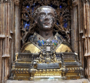 ¿Y en Zaragoza? Porque al fin y al cabo, aunque naciera en Huesca (algo sobre lo que hay dudas, la verdad), de toda la vida es sabido que “el buey no es de donde nace, sino de donde pace”, y la carrera la hizo en Zaragoza. La cuestión es que en la Edad Media un rey de Aragón pidió a un rey de Portugal que tuviera un detalle y le mandara un trozo del santo. Aún la conservamos, que para algunas cosas seremos dejaos, pero para otras… en el retablo mayor de la Seo está este busto-relicario, y dentro… pues eso, que está dentro. Ahora mismo no sé qué parte del cuerpo será la que se conserva en su interior, pero desde luego el relicario es maravilloso. Es uno de los cuatro que regaló el Papa Luna a finales del siglo XIV y que se habían hecho en los talleres de Avignon (los otros son los de San Lorenzo y San Valero, además del de Santa Engracia, este último desaparecido).