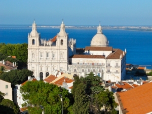 Cuando uno pasea por Lisboa hay algo relacionado con Zaragoza que está por todas partes. En las farolas, en las papeleras, en los membretes de las cartas oficiales, en el pavimento… ¿No os imagináis qué puede ser? Pues el escudo de la ciudad, un barco con dos cuervos. ¿Y qué tiene que ver? Si fuera la Virgen del Pilar, un adoquín, yo qué sé… estaría claro. Pero así… ¿No os imagináis lo que pasó? Pues eso mismo, que los cristianos de Valencia pusieron el cuerpo de San Vicente en un barco, vigilado por los cuervos, y él solico fue navegando, navegando… hasta el sur de Portugal, ni más ni menos. Si esto no es un milagro, que baje Dios y lo vea. El caso es que hoy, en el escudo de Lisboa, aparece ese barco con los cuervos protegiendo a San Vicente, y dominando todo el paisaje de Alfama está la espectacular basílica de San Vicente da Fora (de fuera, fuera de la muralla) pagada por Felipe II cuando logró ser rey de Portugal. Allí sigue estando el cuerpo (el suyo o… el de quien sea). La próxima vez que vayáis a Lisboa no os perdáis el increible placer de caminar por sus tejados con el Tajo a vuestros pies. Por cierto, la cúpula que aparece por detrás en la fotografía es el Panteón Nacional, y ¿sabéis a quién está dedicado? Pues a Santa Engracia (santa portuguesa, por otra parte). Más zaragozano todo, imposible.