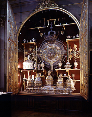 ¿Qué es eso de un relicario? Pues la cosa es sencilla: un objeto para guardar reliquias, así de fácil. Y una reliquia, ¿qué es? Pues si acudimos al diccionario de la Real Academia nos da bastantes definiciones, pero todas van por el mismo camino. Algo del pasado, que se ha conservado de forma casi milagrosa. Y además, algo por lo que tenemos una especial veneración: el abanico con el que la bisabuela se quitaba los sofocos, por poner un ejemplo. Pero hay más, y aquí viene lo que nos importa: una reliquia es un trozo del cuerpo de un santo, o de Cristo, o de la Virgen, o algo que tuviera relación con ellos. Desde el prepucio de Cristo hasta el polvo de la Santa Casa, pasando por las plumas del arcángel Gabriel, gotas de leche de la Virgen o la túnica de San Vicente, de la que hablábamos ayer. Y claro, como una reliquia es algo muy apreciado y querido no se puede guardar de cualquier manera, ni mucho menos. Necesitamos un relicario cuanto más rico mejor, que no es para guardar cualquier cosa. Y no sólo eso: cuando tenemos muchas reliquias guardadas en muchos relicarios podemos hacer grandes y espectaculares armarios para guardarlo todo, o incluso una capilla cubierta de reliquias desde el suelo hasta el techo, como la que hay en la iglesia del Seminario de San Carlos.