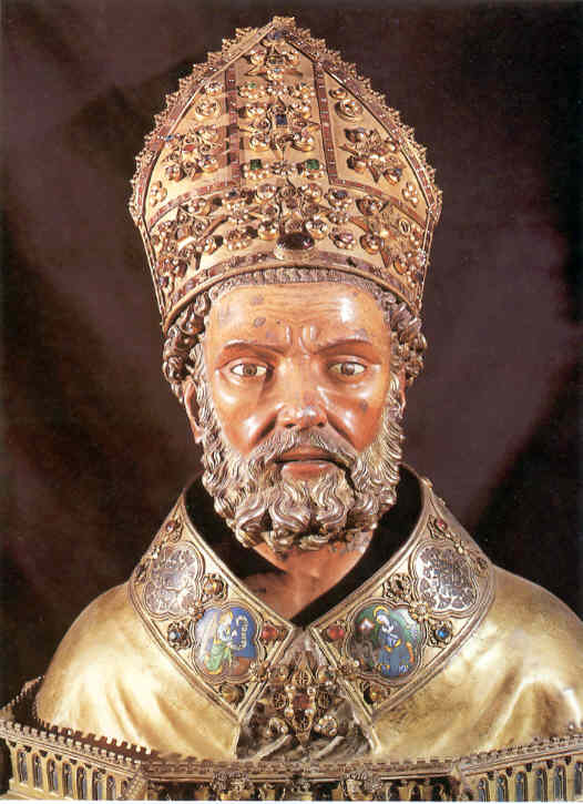 Los tres bustos representan a tres santos muy relacionados con la archidiócesis de Zaragoza: San Lorenzo, San Valero y San Vicente. Y los tres contienen en su interior reliquias de cada uno de ellos. Ayer hablamos de San Vicente y hoy le toca el turno al patrón, San Valero, que como está en el centro salta a la vista que es el más importante de los tres, o por lo menos el que nos toca más de cerca.
