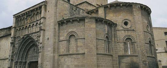 El camino de Santiago, que pasa a sus pies, nos llevará hasta la misma puerta de la iglesia de Santa María la Real de Sangüesa, a orillas del río Aragón, que conserva una de las portadas esculpidas más impresionantes del románico español.