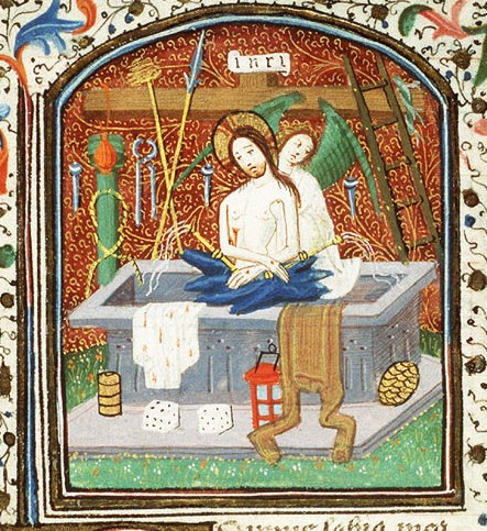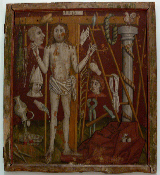 A finales de la Edad Media, en un mundo en el que se identifica a cualquier personaje importante por su escudo, sus armas, se empieza a pensar cuáles serían las de Cristo y se llega a una conclusión claro: los instrumentos de su pasión. Al principio aparecen la cruz, la corona de espinas, la columna a la que fue atado para flagelarlo… pero pronto se multiplican y podemos encontrar al gallo (“Antes de que el gallo cante dos veces tú me habrás negado tres“, le dijo Jesús a Pedro), la bolsa de las 30 monedas que cobró Judas por su traición, la lámpara con la que iluminaron el camino los soldados que subieron a prenderle al monte de los olivos, la escalera para subir a la cruz… y también su túnica y los dados con los que se la jugaron. ¿Los veis en esta imagen? Os pongo otra en la que también se pueden apreciar perfectamente: