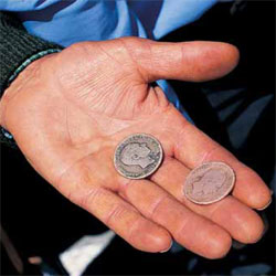 Con esto queda claro que está más que justificado jugar en Viernes Santo, ¿no? Al fin y al cabo lo que se hace es recordar un episodio concreto de la pasión de Cristo (hay otra hipótesis, que recuerda que Judas se jugó las treinta monedas que cobró por entregar a Cristo). Ahora bien, en Calzada de Calatrava no juegan con dados, sino con monedas de época de Alfonso XII (que llevan la cara del rey, claro, y de ahí el nombre del juego). Dos monedas, concretamente.